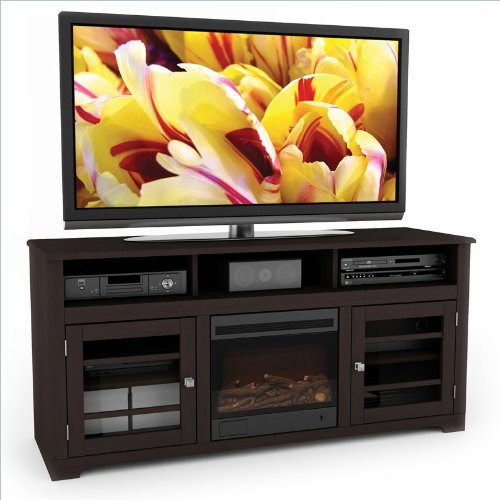 Tempered safety glass cabinet doors with horizontal trim Dark Espresso Stained Wood Veneer Accommodates up to a 68" TV Pairs perfectly with the Sonax FPE-1000 Electric Fireplace Insert Combination of open and concealed storage space